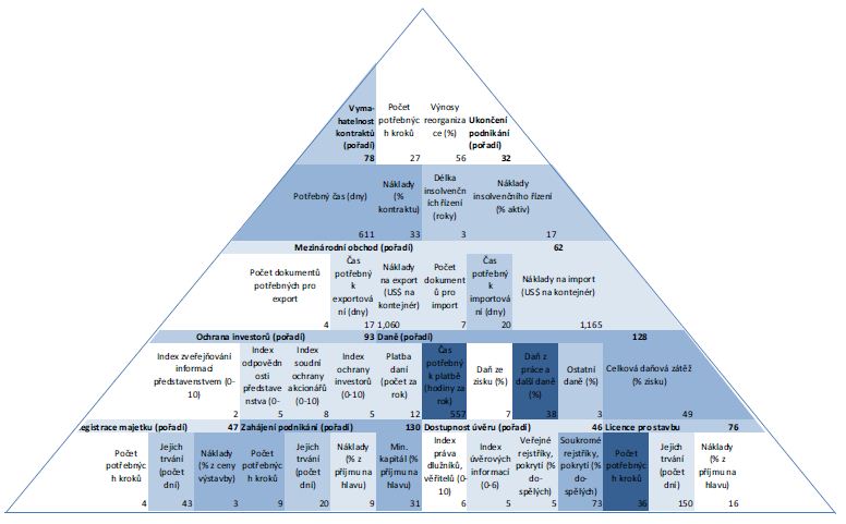Proč pyramida (či trojúhelníkové schéma)? Částečně navázání na dřívější pyramidu konkurenceschopnosti a částečně vlastní symbolika. V základně jsou nutné podmínky pro zahájení podnikání, uprostřed pak podmínky usnadňující podnikání a ve špičce třešničky na dortu jako snadnost ukončení podnikání.
