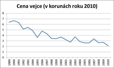 Zdroj dat: Český statistický úřad (ceny vajec převedeny pomocí míry inflace na porovnatelné ceny roku 2010). Český statistický úřad ceny z posledních dvou let zatím v této tabulce neaktualizoval, ale my si je pamatujeme z obchodů a tak je dokážeme sami porovnat s posledními dvaceti lety.